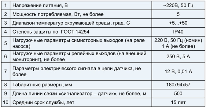 • мониторинга (дистанционного контроля) работы насосов и контроля достижения аварийного уровня — имеются три группы замыкающих контактов реле;